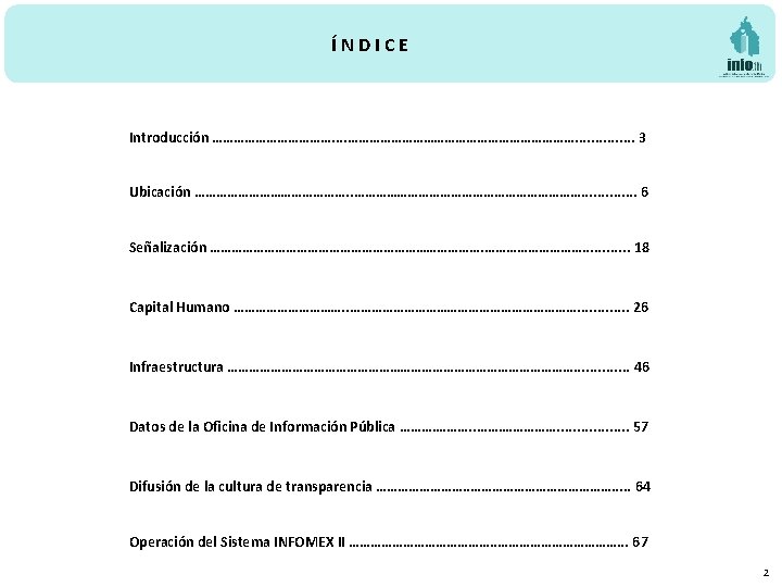 Introducción De acuerdo a lo establecido en el artículo 71, fracción XXII de la Ley de Transparencia y Acceso a la Información Pública del Distrito Federal (LTAIPDF), el Instituto de Acceso a la Información Pública y Protección de Datos Personales del Distrito Federal (Info. DF) ha establecido un programa de visitas a las instalaciones de las Oficina de Información Pública (OIP) de los Entes Obligados, con el fin de verificar las condiciones de infraestructura y de servicio en que se desarrolla el acceso a la información y la rendición de cuentas. Este programa se denomina Diagnóstico Integral de las Oficinas de Información Pública. Los principales aspectos evaluados en las vistas de inspección son los siguientes: • • La ubicación de la OIP La señalización sobre la ubicación de la OIP El capital humano de la OIP La infraestructura de la OIP Los datos de la OIP Difusión de la cultura de la transparencia La operación del Sistema INFOMEX El análisis de los datos obtenidos permite detectar áreas de oportunidad para generar acciones que optimicen el desempeño de las OIP y brindar un mejor servicio a los usuarios.
