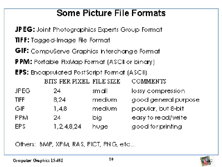 O que é uma imagem? • Para nós, a grosso modo, efetivamente, imagem é formada por três matrizes bidimensionais de picture elements (pixels) que codificam a radiação eletromagnética emitida ou refletida por cada ponto correspondente da cena medida em três comprimentos de onda diferente, quantizados em valores, geralmente, de fácil manipulação (inteiros, char).