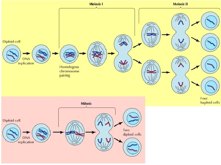Eventos importantes que ocorrem durante a meiose: • Crossing Over – troca de pedaços entre cromátides de cromossomos homólogos; • Meiose I – ocorre a separação dos homólogos, reduzindo o número cromossômico de 2 n para n. Note que as células já são haploides no início da meiose II !!! • Meiose II – ocorre a separação das cromátides-irmãs (rompimento do centrômero), resultando em 4 células haploides.