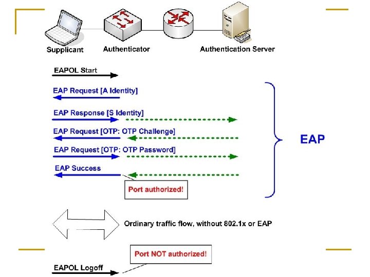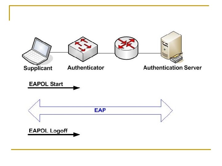802. 1 x Terminology n Um autenticador que autentica o acesso, via um servidor de autenticação. n O supplicant (cliente) que é quem está sendo autenticado.