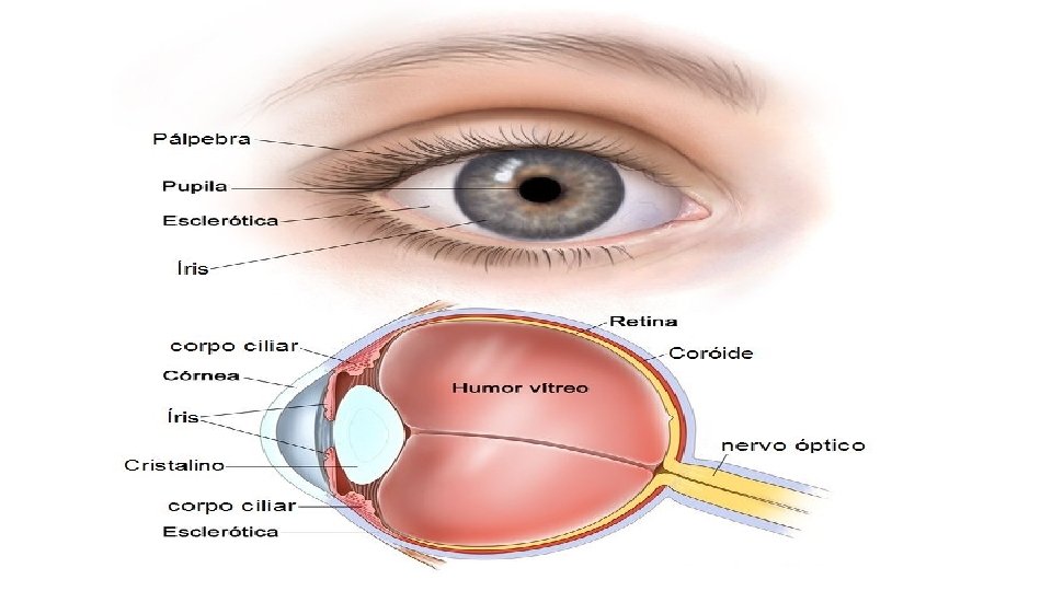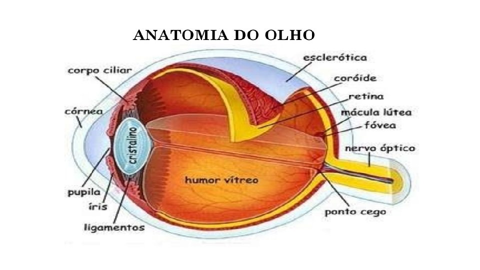 • Córnea: (membrana transparente e curva) -é responsável pela passagem da luz -cobre a Íris • Humor aquoso: -fluido aquoso que se situa entre a córnea e o cristalino, preenchendo a câmara anterior do olho • HUMOR VÍTREO: -Fluído mais viscoso e gelatinoso -Situa-se entre o cristalino e a retina, preenchendo a câmara posterior do olho. -Sua pressão mantém o globo ocular esférico.