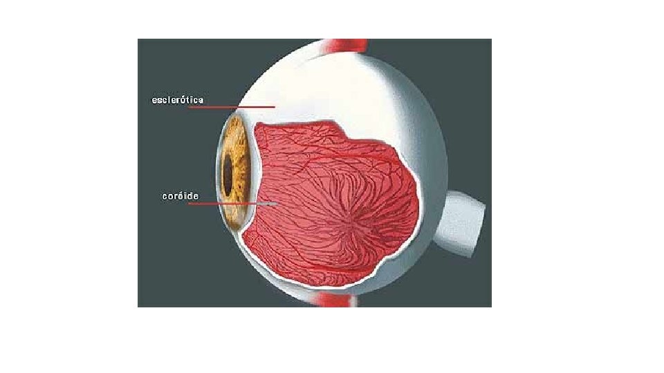 O olho é revestido por três membranas: esclera, coróide e retina • Esclera ou Esclerótica: (camada mais externa, camada branca do olho) -formada por tecidos conjuntivos -preservam a forma dos olhos (manter formato do olho) -serve de apoio para os músculos que o movimentam *na parte anterior do olho, no lugar da esclera, localiza-se a CÓRNEA (que é uma membrana frontal transparente), -atua como para-brisa -protege a região interna do olho