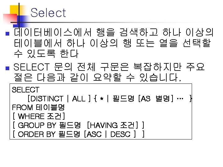 SQL – Order by n 정렬 n n Select * from t_div where div_i_price > 10000 order by div_i_price desc