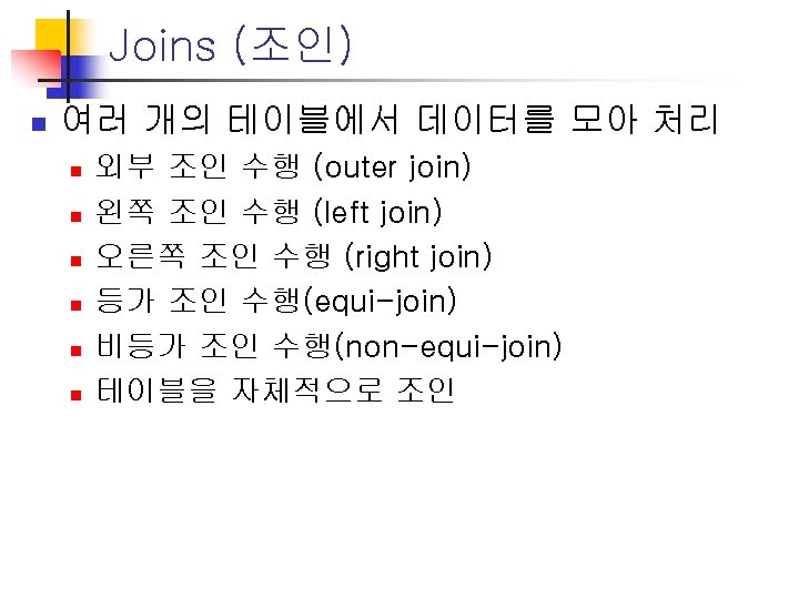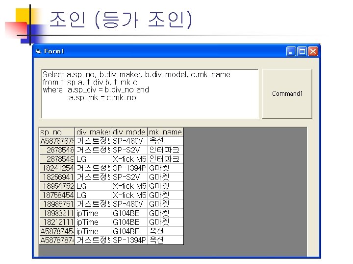 조인 (등가 조인) n n Select * from t_sp Select * from t_mk Select * from t_div Select a. sp_no, b. div_maker, b. div_model, c. mk_name From t_sp a, t_div b, t_mk c Where a. sp_div = b. div_no and a. sp_mk = c. mk_no