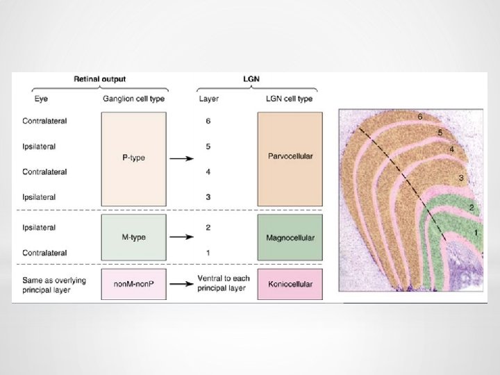 LATERAL GENICULATE NUCLEUS (LGN) q LGN is composed of 6 layers q Layers 1 and 2 contain larger neurons q Layers 3 - 6 contain smaller neurons
