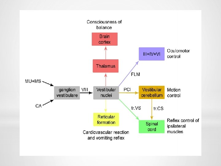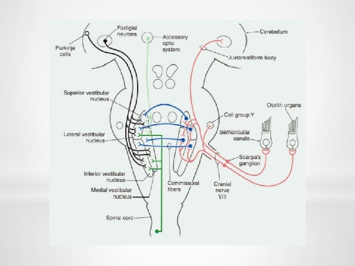 VESTIBULAR PATHWAY q 1 st order neuron – vestibular ganglion (utriculoampullar nerve, saccular nerve, posterior ampullar nerve) q 2 nd order neuron – vestibular nuclei (superior, inferior, medial, lateral)