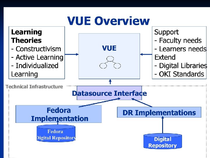 VUE Implementation - Fedora OKI Bridge Fedora Object Model n OKI. DR API n OKI. DR asset model n Fedora – OKI bridge n