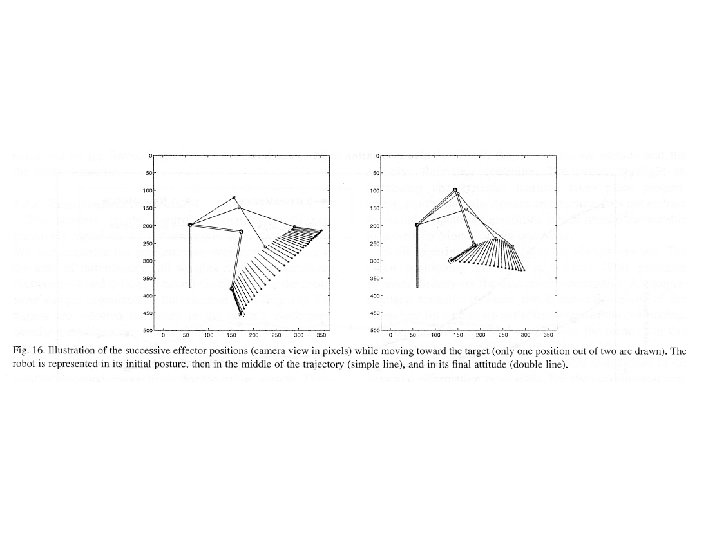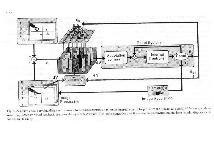 Visual servoing • Realimentación de aprendizaje – Se basa en la aplicación de la inversa del Jacobiano de los parametros de configuración – Los métodos adaptativos calculan iterativamente un estimador del Jacobiano inverso – La aproximación se usa para estimar los comandos motores (variaciones en el espacio de configuración)