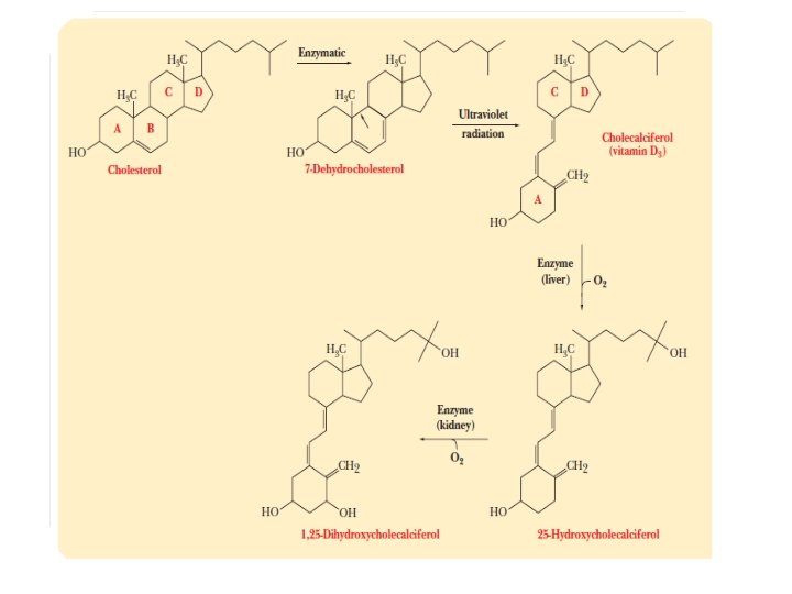 Synthesis of vitamin D in the skin • Structurally, Vitamin D is derived from a steroid. • It contains 3 intact rings (A, C and D) with a break between carbon 9 and 10 in the B ring. • The steroid 7 - dehydrocholestrol is synthesized and secreted on the skin surface. • The conjugated double bonds (57) B allow the absorption of UV light. • In the skin with UV cause ring B opining and forming previtamin D 3, followed by rearranged to D 3 (cholcalciferol).
