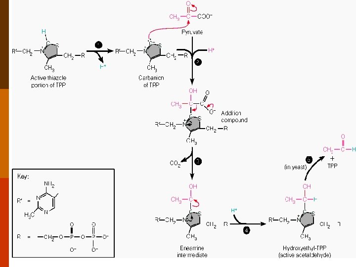 p p p Di dalam otak dan hati segera diubah menjadi TPP = thiamin pyrohosphat oleh enzim thiamin difosfotransferase, reaksi membutuhkan ATP Berperan penting sebagai koensim dekarboksilasi senyawa asam-keto Beberapa enzim yang menggunakan TPP sbg koensim: pyruvate decarboxylase, pyruvate dehydrogenase, transketolase.