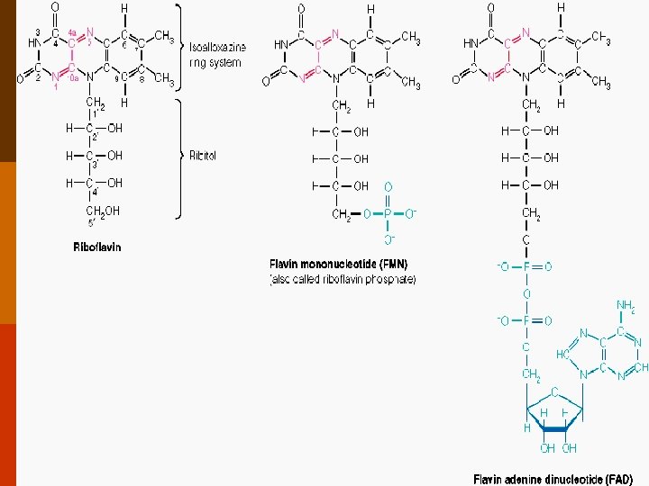 p p Merupakan prekursor kofaktor : n flavin mononukleotida (FMN) n flavin adenine dinukleotida (FAD) Ensim yang memerlukan kofaktor tersebut flavoprotein Riboflavin + ATP = FMN + ATP = FAD
