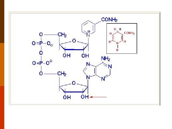 p p p Niasin dibutuhkan untuk sintesis vitamin B 3, NAD (nicotinamida adenin dinucleotida), dan NADP+ (nicotinamide adenine dinucleotide phosphate) NAD dan NADP = kofaktor pada enzim dehidrogenase, yang berfungsi dalam reaksi redoks donor dan akseptor elektron NAD n n p p byk digunakan pd glycolisis, oksidasi asam lemak, metabolisme badan keton Cenderung berperan sbg akseptor elektron pd reaksi katabolisme NADP sintesa asam lemak dan PPP Contoh laktat atau malat dehidrogenase