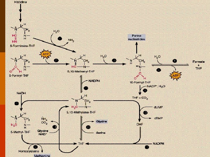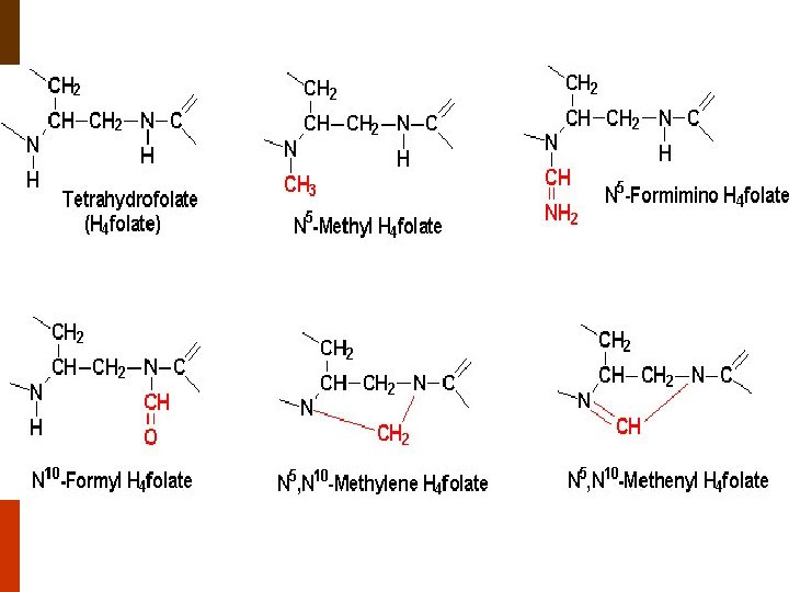 p p p p Asam pteroat berkonjugasi dengan glutamat asam folat Banyak terdapat di khamir, daun sayur 2 an dan hati hewan, kuning telur dan jus jeruk Hewan tidak dapat mensintesis PABA dan glutamat harus diperoleh dari makanan Asam folat kofaktor THF – tetrahidrofolate THF penting dalam reaksi transfer / membawa 1 atom C baik dalam bentuk metil, methilene, formimino, formil , methenil Penting dalam sintesis serin, metionin, glisin, purin. Dibutuhkan pada ibu hamil peningkatan proliferasi sel di dlm darah pada tri semester pertama