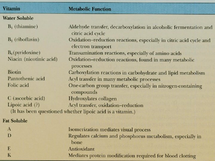 • molekul organik yang di dalam tubuh mempunyai fungsi yang sangat bervariasi • Fungsi dalam metabolisme yang paling utama adalah sebagai kofaktor • Di dalam tubuh diperlukan dalam jumlah sedikit micronutrient • Biasanya tidak disintesis di dalam tubuh. Jika dapat disintesis jumlah tidak mencukupi kebutuhan tubuh. Sehingga diperoleh dari makanan / diet