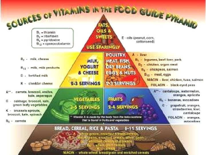 p p p Normal asupan 1, 0 – 1, 5 mg/hari = orang dewasa Jika makanan kita banyak mengandung karbohidrat dibutuhkan lebih banyak thiamin Tanda-tanda defisiensi : n Menurunnya nafsu makan n Depresi mental n Peripheral neurophaty n Lemah Defisiensi kronis = gejala kelainan neurologis spt kebingungan (mental), kehilangan koordinasi mata Penyakit karena defisiensi tiamin : Beri-Beri akibat makanan yang kaya akan karbohidrat tetapi rendah thiamin