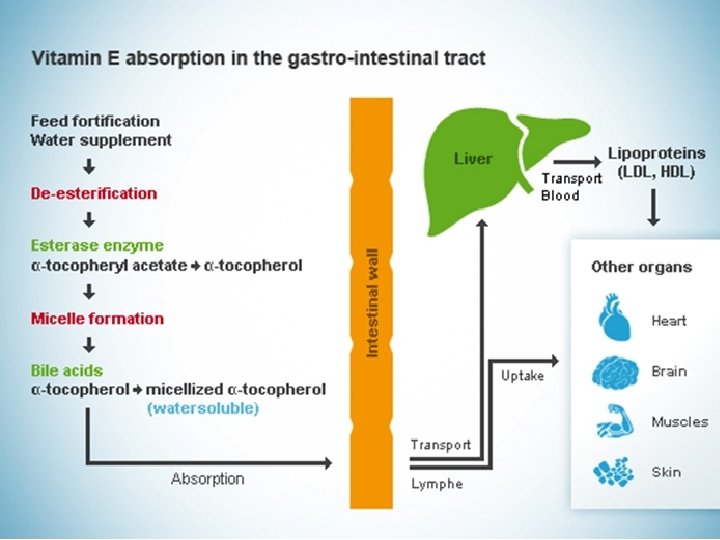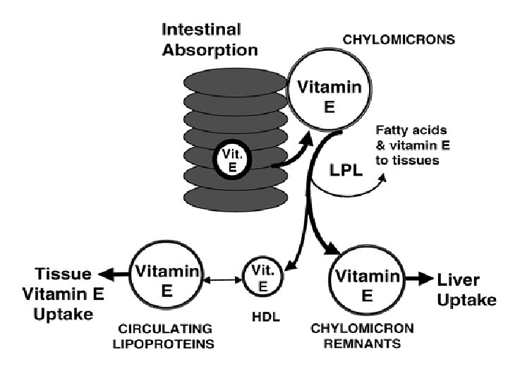 • Storage • Vitamin E is a lipid soluble vitamin and therefore over 90% of total body vitamin E is found in the adipose tissue. • Excretion • Vitamin E is excreted mainly via bile, urine, feces, and the skin. • The vitamin is oxidized and forms hydroquinone and then is conjugated to form glucuronate. • Once formed the glucuronate can be excreted into bile or further degraded in the kidneys and excreted in the urine. Because of the poor intestinal absorption of vitamin E, fecal excretion is the main route of vitamin E elimination.