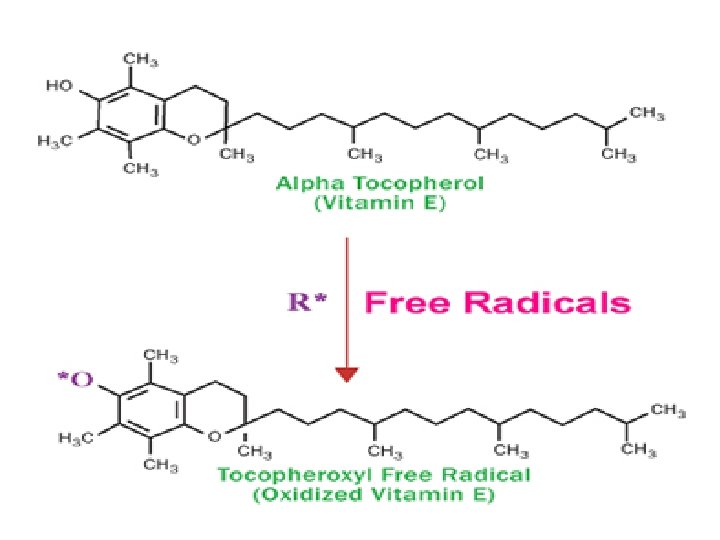 • Mechanism of action of antioxidants, vitamin E Free radicals, such as superoxide, hydroxyl ions and • nitric oxide all contain an unpaired electron. These radicals can have a negative effect on cells • causing oxidative damage that leads to cell death. Antioxidants, such as vitamin E due to its lipid solubility is particularly important in protecting cell membranes, prevent cell damage by binding to the free radical and neutralizing its unpaired electron. The resulting tocopherol radical is then reduced back • to tocopherol by glutathione, vitamin C or other molecules. Thus the free hydroxyl group on the aromatic ring is responsible for the antioxidant properties.