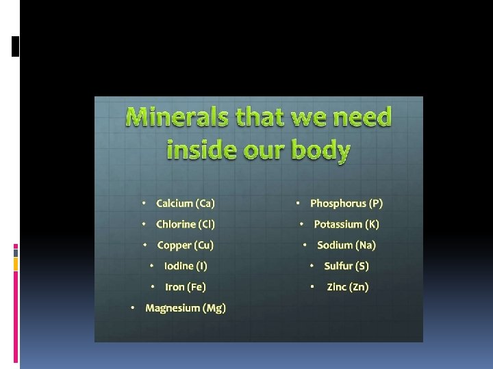 Why Minerals? Important for normal metabolism Found in tissues and fluids in the body Macro and micro