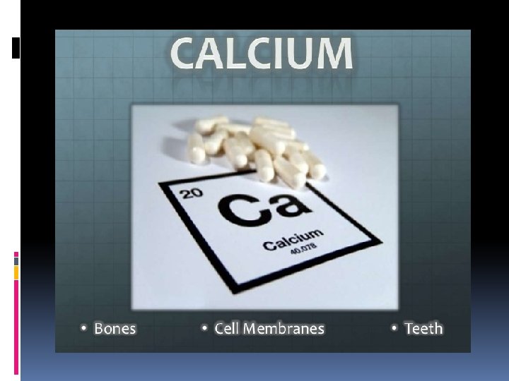 Calcium Important for structure of bones and teeth Has a role in muscle contraction and blood clotting Sources: Milk and milk products, fortified orange juice, sardines Adequate Intake is 1, 000 milligrams for people between 19 -50 years old