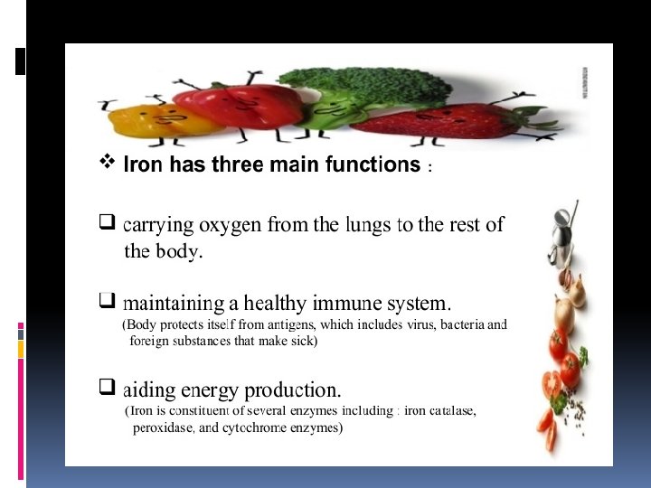Iron Part of heme which carries oxygen in blood Iron deficiency anemia causes tiredness