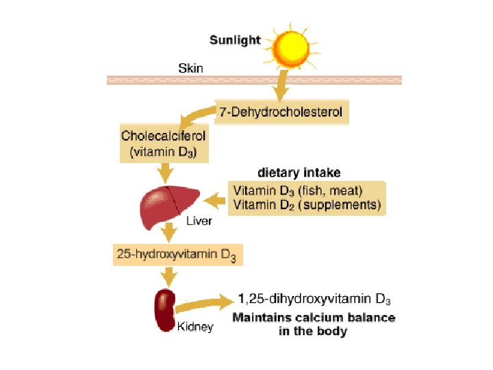 v Prekurzory vitaminu D: o 7 - dehydrocholesterol (živočichové) → vitamin D 3 (cholekalciferol) o Ergosterol (rostliny) → vitamin D 2 (ergokalciferol) v Vitamin D 2 a vitamin D 3 → kalcitriol (1, 25 dihydroxyvitamin D) v Aktivní forma – kalcitriol vzniká hydroxylací v játrech a ledvinách