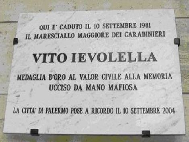 L’attentato… Il 10 settembre del 1981 alle 20: 30 circa, il Maresciallo Vito Ievolella era in compagnia della moglie Iolanda a bordo della loro Fiat in via Serradifalco, stava aspettando che la figlia 20 enne Lucia Assunta uscisse dalla scuola guida dove frequentava un corso per il conseguimento della patente. All’agguato parteciparono quattro killer mafiosi armati di pistole e fucili, giunti a bordo di una Fiat Ritmo, risultata poi rubata, scesi dall’autovettura fecero fuoco in direzione del Maresciallo Ievolella uccidendolo; la moglie riportò una leggera ferita alla regione sopracciliare destra. Il mezzo usato dai killer fu dato alle fiamme e poi abbandonato in via Caruso, dove fu ritrovato dai carabinieri.