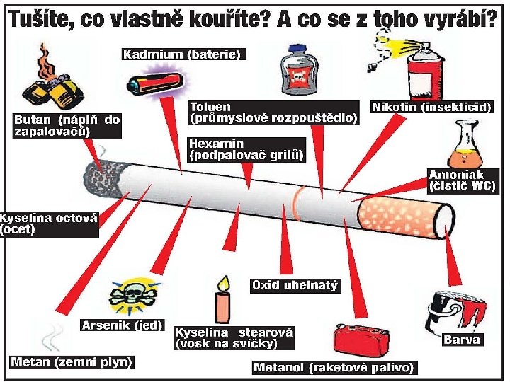 • Dehet ▫ tmavá hmota ▫ tvoří se při chladnutí a kondenzaci kouře ▫ nositelem chuti a vůně • Oxid uhelnatý , CO ▫ důsledkem nedokonalého spalování při kouření ▫ vzniká karboxyhemoglobin COHb (brání přenosu O 2 do bb. a tkání)