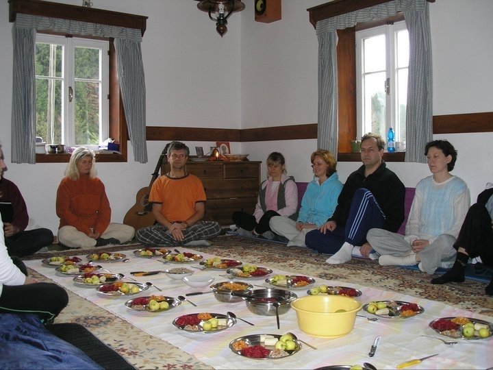 11 dní ve Slovenském Ráji Vitariáni – strava 2 x denně !!! • Před snídaní: cca 1 h jóga / rozcvička • Snídaně cca 8 -10 h: 1. Česnek s jablkem 2. Máčené zrní a ořechy, ovoce (=nízké GL) • • Náročná túra cca 20 -30 km terénem Večeře cca 18 h: 1. Cibule s jablkem 2. Zelenina, luční byliny, luštěniny – různé saláty • • Po večeři: jóga a dechová cvičení, zpěv Před spaním: 1. „Prašad“ – pár ořechů a suš. ovoce / kousek čokolády