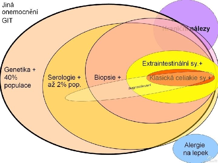 • Klasická forma celiakie v dospělém věku (plně rozvinutá) – Se vyskytuje pouze u 30– 40 % nemocných – Příznaky velmi kolísají, mohou i zcela chybět • U většiny nemocných – – • Je projevů onemocnění velmi málo Jsou nevýrazné Často mají mimostřevní charakter Podle studií z posledních let je zřejmé, že 80 -85% pacientů s celiakií žádné zjevné nebo “typické” příznaky nemá a na celiakii se přichází náhodně V průběhu stárnutí – Gastrointestinální symptomy celiakie slábnou – Již u školních dětí často převažují mimostřevní příznaky – Příznaky celiakie v pozdějším věku již nejsou tak bouřlivé • Nejčastěji se vyskytují jen mírné bolesti břicha s občasnými řidšími stolicemi. • Průjmy – Jsou často jen nárazově – Lehčího rázu – Emočně závislé a proto i dlouhodobě hodnocené jako funkční, "nervové" • U dětí se jedná hlavně o poruchu růstu. – U neprospívajícího dítěte se zpomaleným růstovým tempem by měla být vždy vyloučena celiakie. • • Přibližně 1/3 dospělých udává celiakii nebo příznaky podezřelé z tohoto onemocnění v dětství. Projevy celiakie v dospělosti – Se objevují nejčastěji mezi 25. až 40. rokem (30. a 50. rokem dle jiného zdroje) – Může jim předcházet některá z celkových zátěžových situací (tzv. spouštěcích mechanismů)