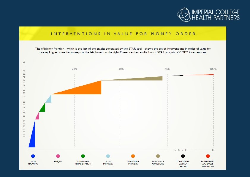 V A L U E F O R M O N E Y O F I N T E R V E N T I O N S POPULATION HEALTH GAIN 3. 9% 3. 8% 19. 7% 17. 2% 6. 9% 48. 5% VISION ASSESSMENT & REFERRAL HOME HAZARD ASSESSMENT MEDICATION REVIEW STRENGTH & BALANCE TRAINING RAPID RESPONSE HOSPITAL ADMISSION £ 6, 986 £ 7, 369 £ 58, 800 £ 81, 868 £ 60, 979 £ 3, 685, 290 0. 2% 1. 5% 2. 1% 1. 6% 94. 5%