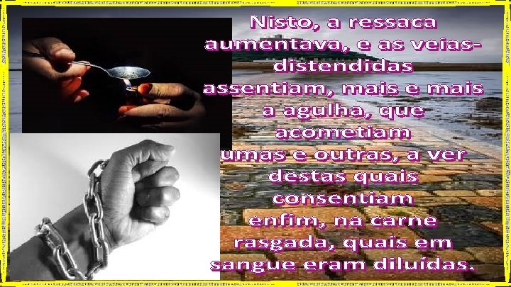 Chegou o dia em que as veias de há muito ofendidas de tão maltratadas, aço contra aço, se debatiam. Nos braços esmagados, que nos olhos lágrimas vertiam Por não arranjar já onde enfiar a seringa: agulhas