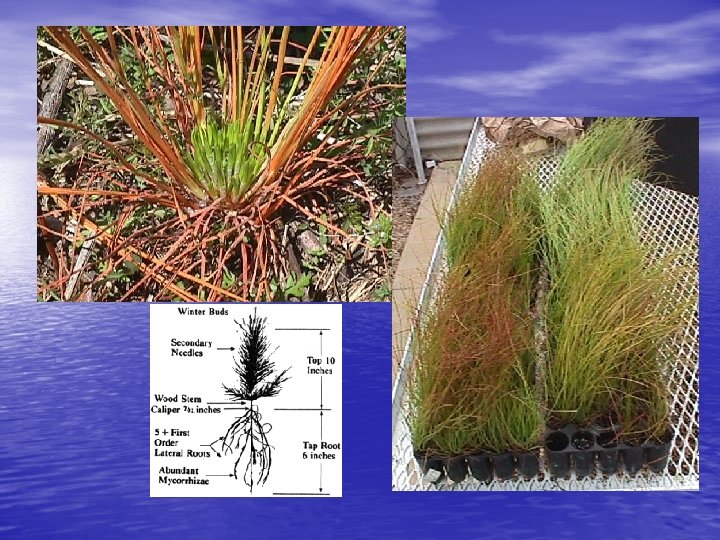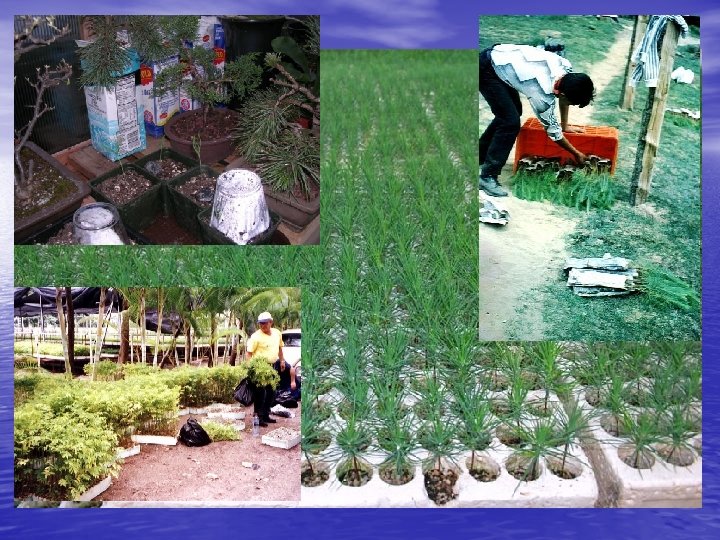 Criterios de calidad … • Relación raíz-parte aérea. Se recomienda en • • términos generales que la relación no rebase el 1. 8 una de otra; se debe establecer la relación para cada especie. Hojas y ramificaciones. La planta debe tener ramificaciones, las plantas espigadas sin ramificar se consideran de mala calidad; las hojas deben tener el color normal de la especie. Estado fitosanitario. No deben presentar signos de enfermedad, deficiencia nutritiva o ataque de plagas.