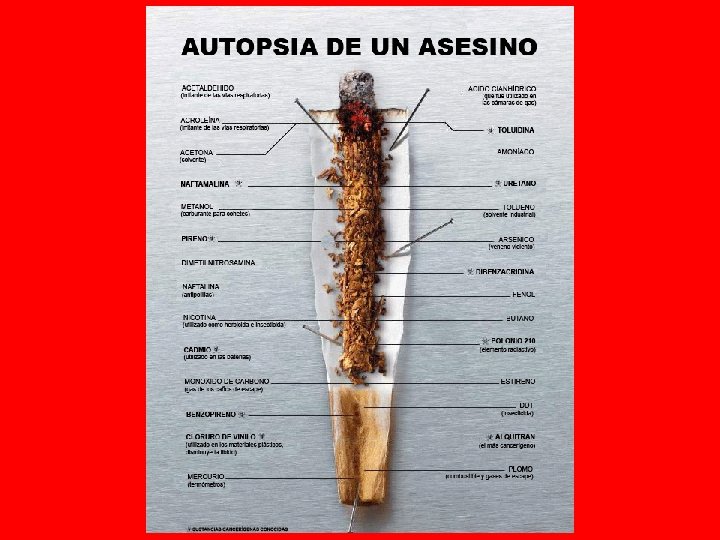 Peligros del tabaco • Nicotina: es una droga, responsable de su adicción. Además, contrae y endurece las arterias, lo cual eleva la presión arterial. • Monóxido de carbono: Este gas reduce la capacidad de los glóbulos rojos de transportar oxígeno. Así, el corazón debe trabajar más para poder mantener el aporte de oxígeno a todas las células. • Alquitrán: Viscosa mezcla de ≈ 3000 sustancias químicas. Al menos 60 de ellas son cancerígenas.