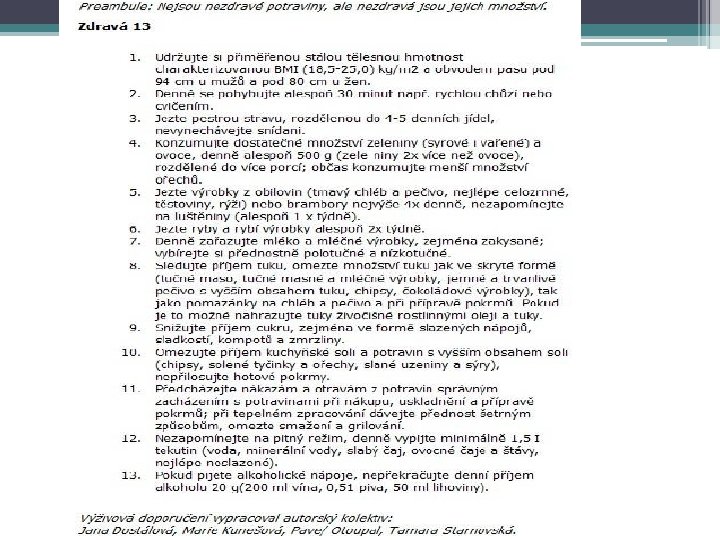 „Zdravá třináctka“ • Společnost pro výživu a Fórum zdravé výživy, 2005 • Shrnutí výživových doporučení pro širokou veřejnost • Doporučení určena pro zdravé osoby, slouží k prevenci civilizačních chorob