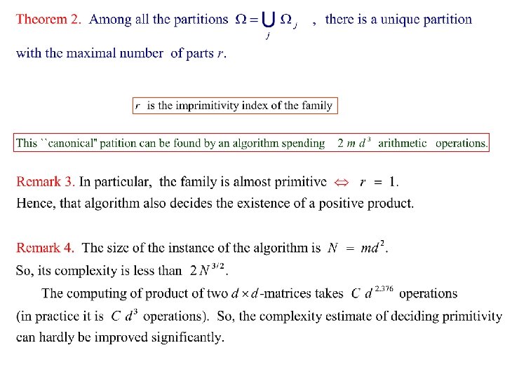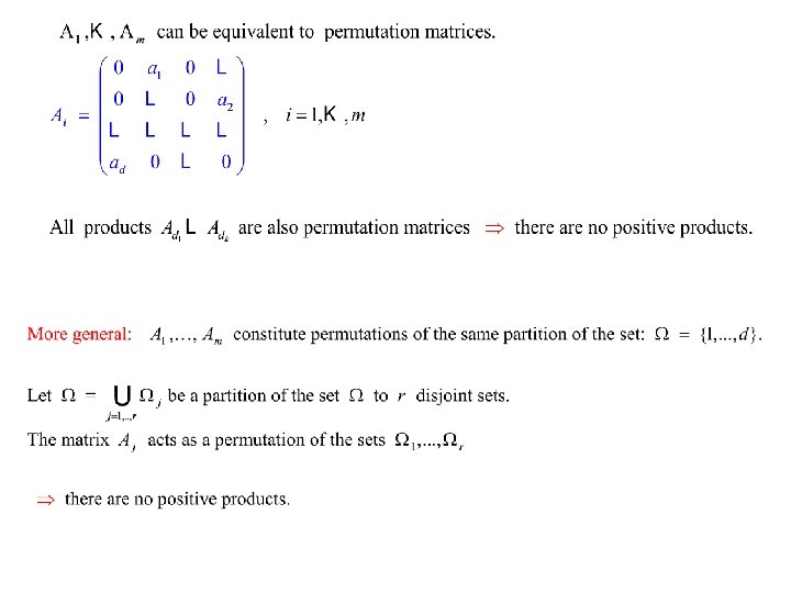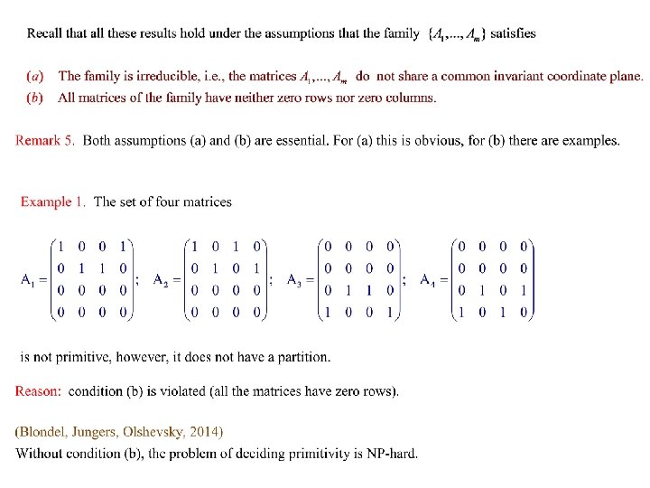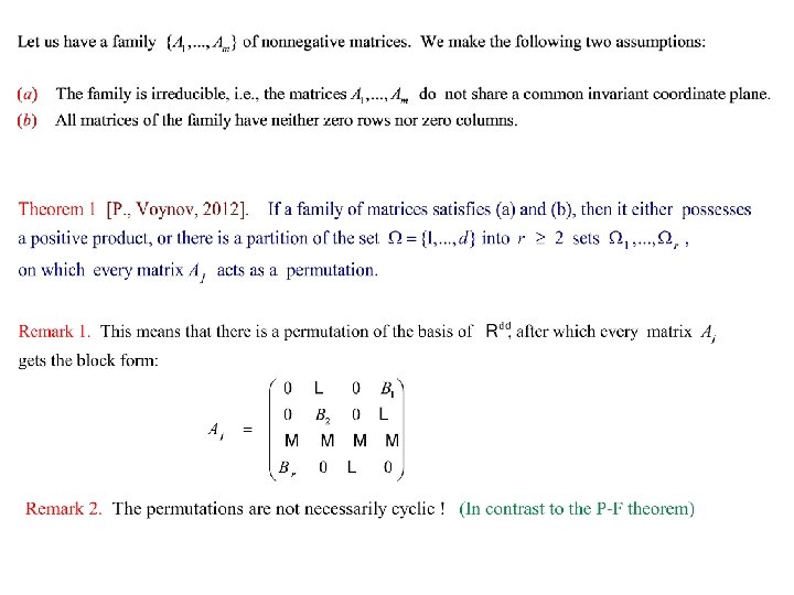 Conclusions Thus, if a family of matrices is not primitive, then all its matrices constitute permutations of the canonical partition. The canonical partition can be found by a fast algorithm. This allows us to extend many results on Lyapunov exponents to general families of nonnegative matrices. In particular, to construct an efficient algorithm of computing the Lyapunov exponents of nonnegative matrices. Other applications: functional equations, succession models in mathematical ecology, etc. Thank you!
