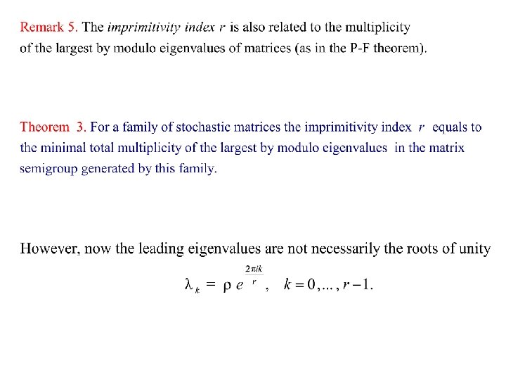 Perron-Frobenius theorem (1912) A matrix A is not primitive if it is either reducible or one of the following equivalent conditions is satisfied:
