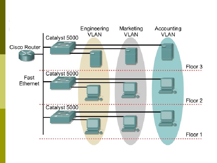 Perbedaan LAN dan VLAN p Bentuk jaringan dengan model Local Area Network sangat bergantung pada letak/fisik dari workstation, serta penggunaan hub dan repeater sebagai perangkat jaringan yang memiliki beberapa kelemahan. p Kelebihan dari model jaringan dengan VLAN adalah bahwa tiap-tiap workstation/user yang tergabung dalam satu VLAN/bagian (organisasi, kelompok dsb) dapat tetap saling berhubungan walaupun terpisah secara fisik. p Terlihat jelas VLAN telah merubah batasan fisik yang selama ini tidak dapat diatasi oleh LAN. Keuntungan inilah yang diharapkan dapat memberikan kemudahan-kemudahan baik secara teknis dan operasional.