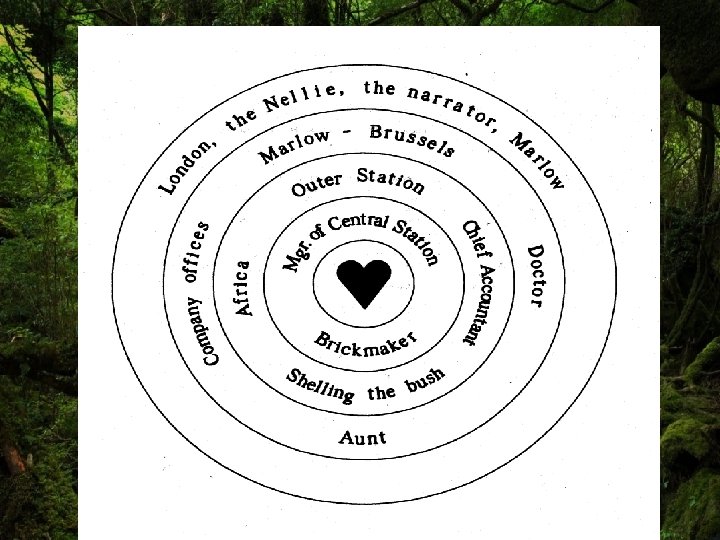 Narrative Style in HOD • The book has a distinct circular structure: the first narrator begins and ends the novel in the same evening while on the boat moored on the Thames. • "Darkness" (excess, madness, destruction) is not only in the jungle but everywhere, even in London, which was the heart of the British empire and its colonialism. • There is a clear progression downward to hell that recalls Dante’s Inferno, and perhaps also Hamlet’s descent into madness.