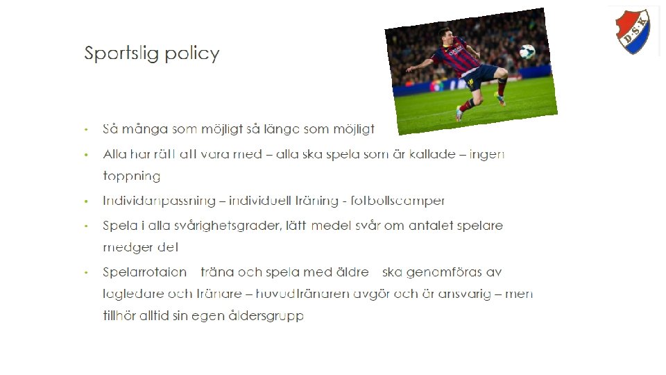 Agenda • • • Sportslig policy Summering 2015 Laget och Roller ”Tränings-tänket” Träningstider • Träningsläger/dagläger Vallen? • Matcher • Gothia info • Långsiktigare planering • Utomlands-läger för 2017 • Socialt för tjejerna • Lagets ekonomi • Insättningar • Andra funderingar som ni har