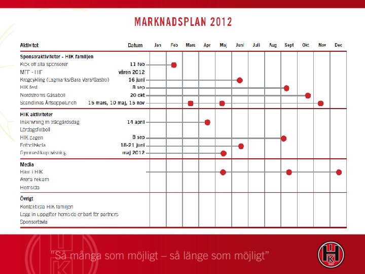 HITTARPS IK – MÅL 2012 ”Så många som möjligt så länge som möjligt” Gymnastik Fotboll Ungdom # Uppdatera måldokumentet # Definiera ”resan” samt gymnastikens framgångsfaktorer # Följa upp framgångsfaktorerna per grupp Boule Senior # I samtliga våra ungdomslag leva upp till definierade framgångsfaktorer # Att våra två representationslag går upp i division tre # Tillsammans med Friends etablera och implementera en värdegrund… # Ett ökat intresse på Laröds IP vid våra hemmamatcher Aktivt finna deltagand e för våra boule herrar # Att gymnastiken integreras tydligare med HIK och att föreningen driver även denna sektion Marknad Idrottsplatsen # ”Sätta marknadsrådet” och definiera uppdraget/agendan # Arbeta för att få fram ett beslut om utbyggnad # Uppnå uppsatt budget # Utveckla HIK drift avtalet KUL Ekonomi # Aktivt söka stiftelsebidrag för uppkomna projekt KAMRATSKAP Medlemmar # Analysera medlemsstocken per 2011. 12. 31 # Under 2012 arbeta fram ett attraktivt HIK medlemskap för lokalt boende person KVALITET