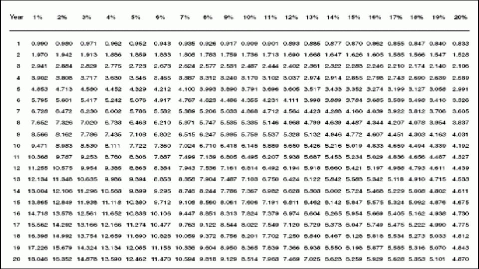 Megoldás Nettó jelenérték • NPVA = -100 + 110/1, 1 + 121/1, 12 = • = -100+ 100 = 100> 0 • NPVB= -180 + 110/1, 1 +121/1, 12+ 133/1, 13 = • = 120> 0 NPV szempontjából a B beruházás a jobb. • NPVe egyenértékes (N* = NPV/járadéktényező) "A" gép esetén: 2 év 10 % kamatláb mellett az annuitás faktor 1, 736 • Az évi egyenértékű pénzáram = 100 / 1, 736 = 57, 607 • "B" gép esetén: 3 év 10 % kamatláb mellett az annuitás faktor 2, 487 • Az évi egyenértékű pénzáram = 120 /2, 487 = 48, 25 Nettó jelenérték egyenértékes alapján az A jobb.