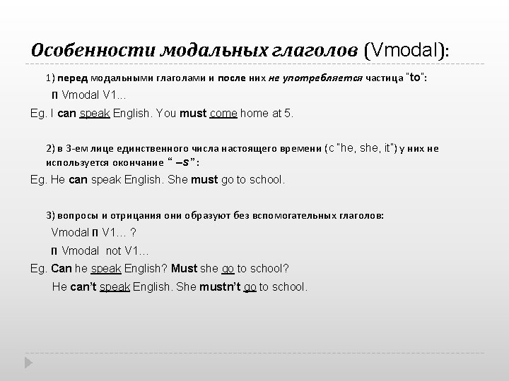 Vmodal + not ( «не …» ) Модальные глаголы с отрицанием “not” имеют сокращенную форму. Eg. I can’t (can not) speak English well. He couldn’t (could not) skate well. She mustn’t (must not) cross the river. You shouldn’t (should not) come home late. В конструкции “be able to” not сокращается с формой глагола “be”. Eg. He isn’t (is not) able to speak English well. You aren’t (are not) able to speak English well. He wasn’t (was not) able to speak English well. You weren’t (were not) able to speak English well. Но! I am not able to speak English well. You won’t (will not) be able to speak English well.