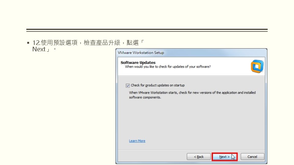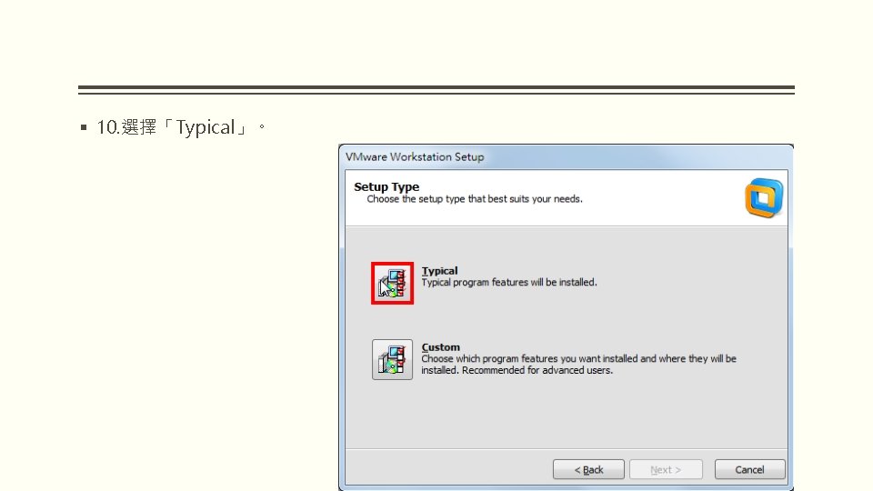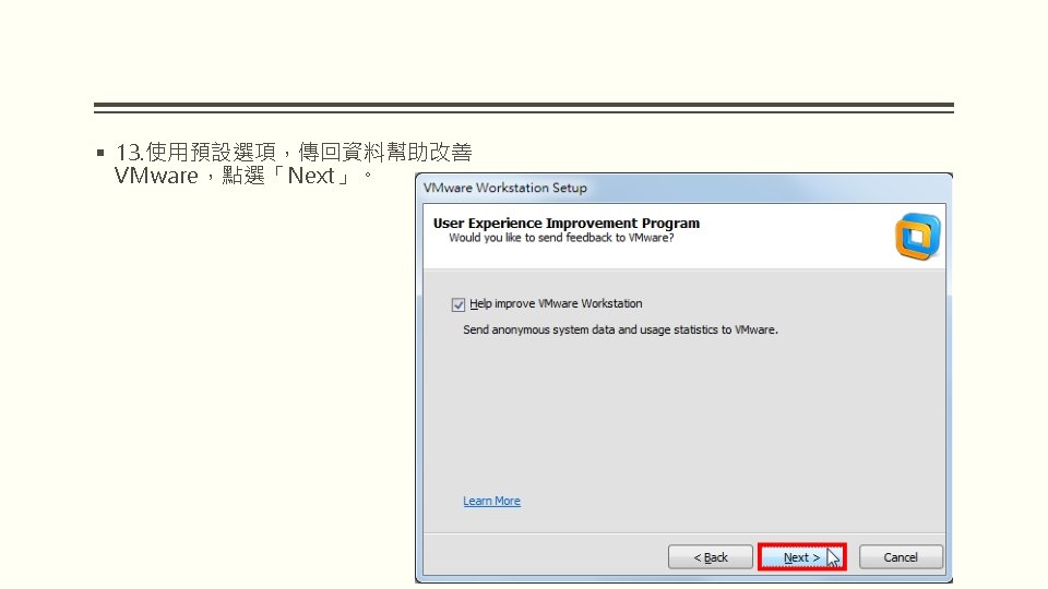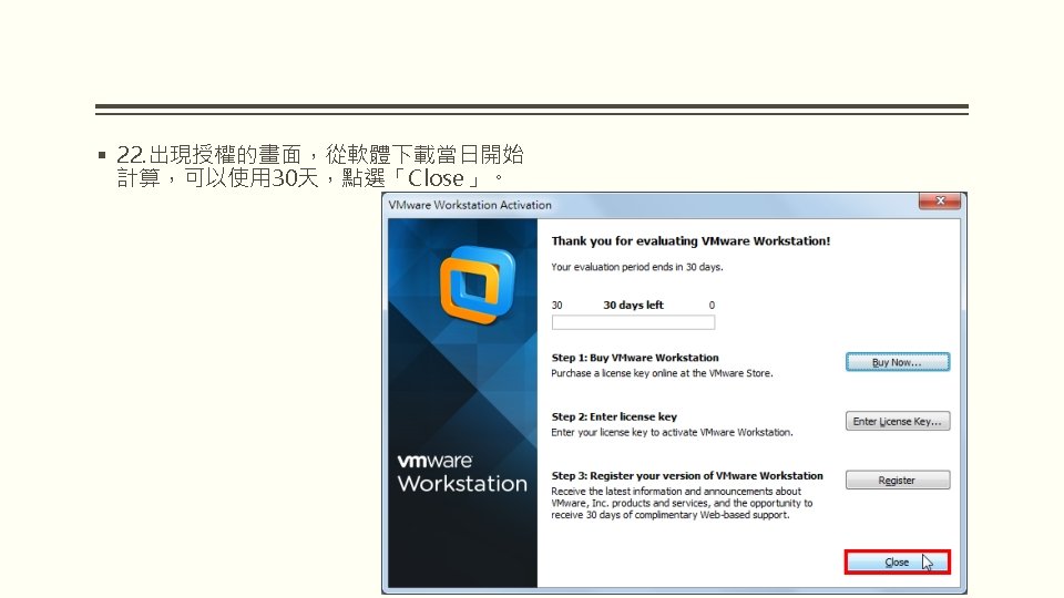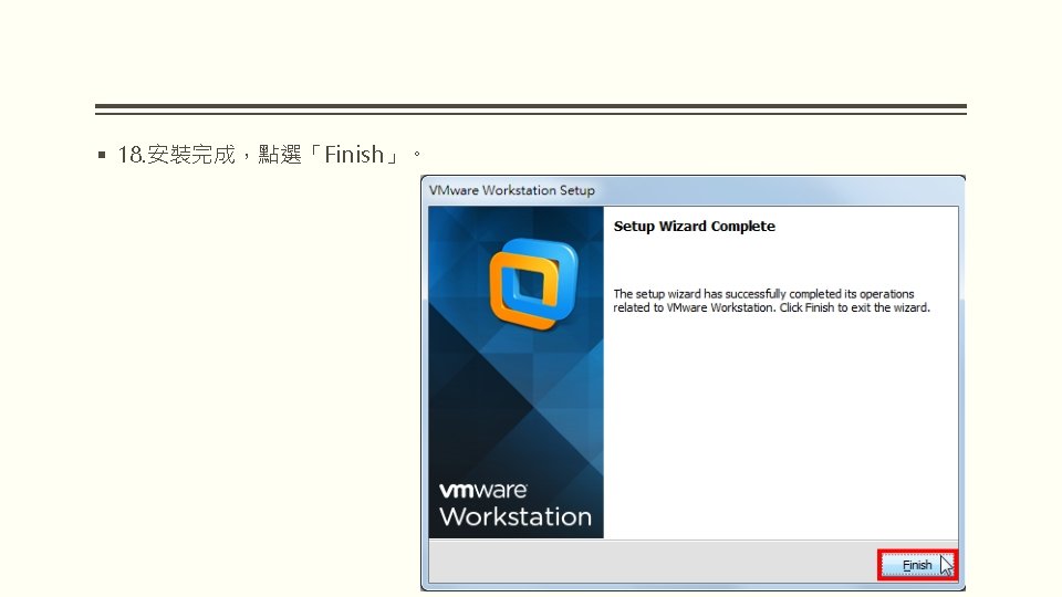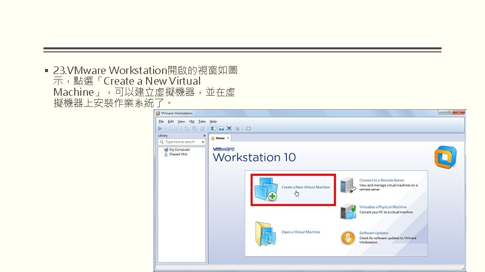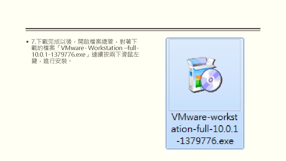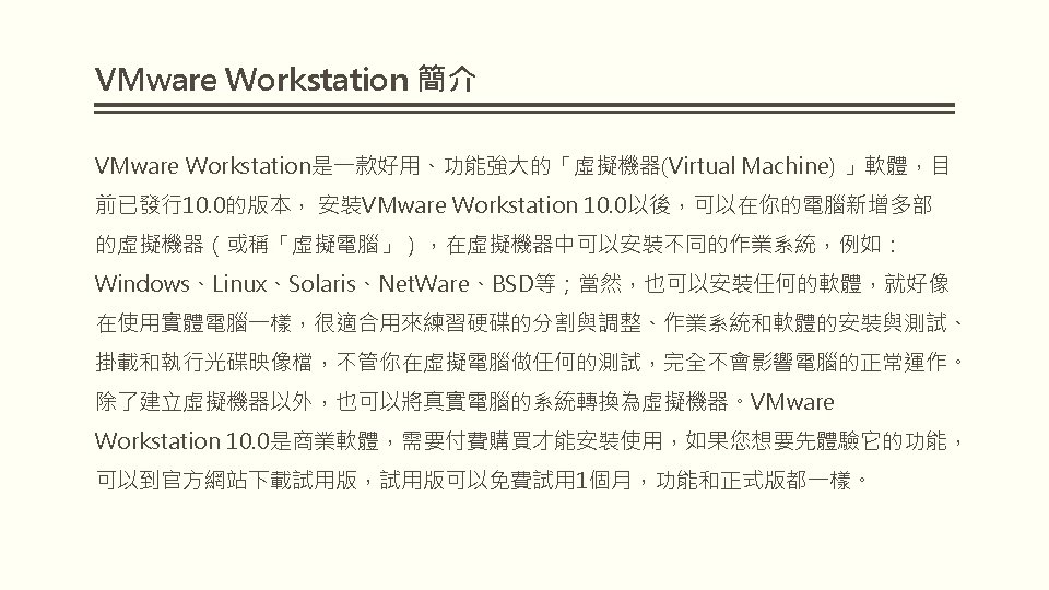 VMWARE WORKSTATION 10 VMware Workstation 10 2 WindowsVMware Slides: 25 Download presentation VMWARE WORKSTATION 10 安裝與配置 VMware Workstation 10 安裝與配置 2. 因為要安裝在Windows,所以選擇「VMware Workstation 10 for Windows」的「Go to Download」。 § 3. 點選「Download Now」。 § 5. 勾選「I agree to the terms…」,點選 「Accept」。 § 9. 選擇「I accept the terms in the license agreement」,點選「Next」。 § 15. 點選「Continue」。 § 16. 正在安裝VMware Workstation。 § 19. 對著桌面的VMware Workstation捷徑 圖示,連續按兩下滑鼠左鍵,開啟 VMware Workstation。 § 20. 選擇「I want to try VMware Workstation 10 for 30 days」,試用 30 天,輸入電子郵件,點選「Continue」。