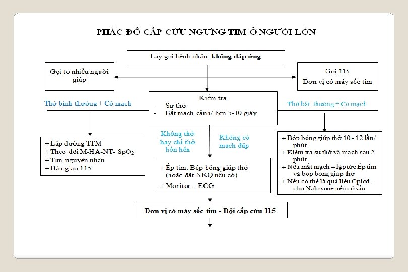 Sơ đồ cho nhóm 4 người Bác sĩ/ Y sĩ: Trưởng nhóm quyết - Điều dưỡng 2 định mọi can thiệp, thuốc. . . - Ép Tim, Duy trì đường thở, Thông khí nhân - Theo dõi nhịp thở, mạch… tạo, (bóng- mask, NKQ) - Bắt mạch, Monitor - Ghi hồ sơ Điều dưỡng 1 - Giúp đặt NKQ, hút đàm - Chuẩn bị dụng cụ cấp cứu. . - Đặt ĐTTM, tiêm thuốc. . . - Cầm máu bên ngoài. Hộ lý : - Hổ trợ bóp bóng - Hổ trợ cầm máu bên ngoài. - Sắp xếp, ổn định vị trí BN và dụng cụ. - Trấn an, cách ly thân nhân BN - Giúp thay y phục cho BN.