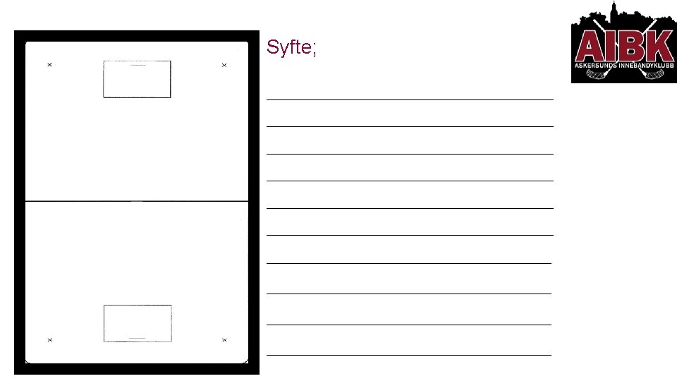 Syfte; Box play 1. I 1 -2 -1 så stör pointen i boxen deras point samt kommer ut i press på deras skyttar. Mittfältarna täcker skott samt slottet genom att jobba med ”gummibandsprincipen”. Bilden visar hur detta sker när en skytt har bollen. Går bollen ner i ett hörn följer kantspelaren med. Spelaren framför mål har en roll som går ut på att ”hålla rent” framför målet. En viktig sak i box play är att spelarna jobbar med klubborna för att skära av passningsvinklar. 2. 2 -2 är en klassisk Box play uppställning. Man försöker att hålla boxen någorlunda intakt och flyttar sig gemensamt. Pilarna visar vilka löpningar en spelare ska ta. De ytor man täcker är samma om bollen är på andra sidan än vad exemplet visar.