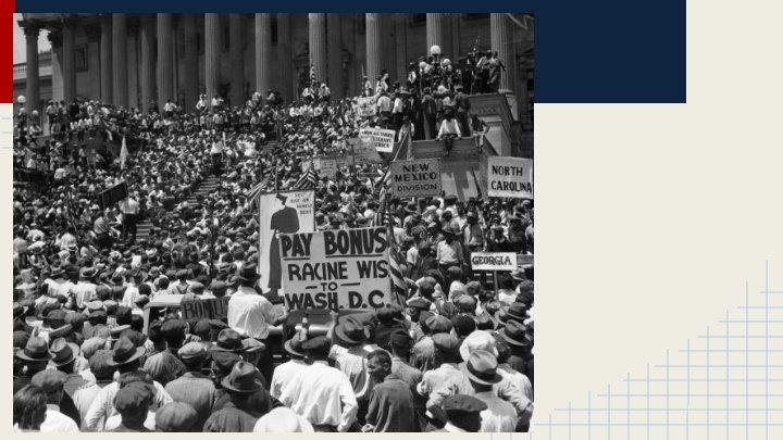 V. ‘Merica gets Angry • • • A) Hunger Marches - Constant looting and protests over hunger. 1, 200 marched on DC in 1932. B) Farm Foreclosures - Farms, with low profits and high debts, lose their farms. Begin burning all crops (people are starving) to raise prices. C) Bonus Army - WW 1 Veterans promised a bonus in 1945. Demanded an early payment of bonus to survive. o 15, 000 veterans marched into DC o 700 (current) Soldiers begin attacking unarmed veterans, killing two. o Disgraces Hoover’s presidency.