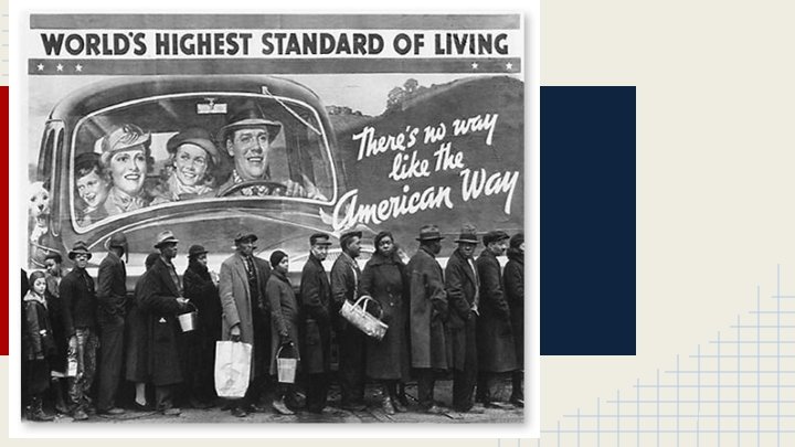 II. Struggling to Get By • • • A) Jobless would go hungry o Stood outside Breadlines / soup kitchens B) Could not afford rent/mortgage o Would not move out o Bailiffs had to evict them C) Many young men became hoboes (AKA Train Kids) D) Many immigrants returned to native countries o Forced to return by government o Deported many E) Severe Drought in middle america creates dust bowl- dry land led to dust storms. Many died of suffocation.