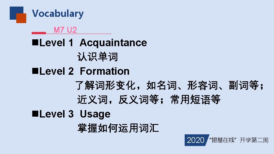 Vocabulary Level 2 12. effective 反义词: 相关词汇: adj. 有效的,实际的;生效的 adv. ineffectively effect / affection / efficient n. 效果 v. 影响 n. 喜欢 adj. 有效率的 13. approval n. 批准;赞成 v. approve 反义词:disapprove of her going to Wuhan同意她去武汉 批准请愿 approve the petition 相关词汇: arrive refuse propose arrival refusal proposal 2020 “锡慧在线”开学第二周