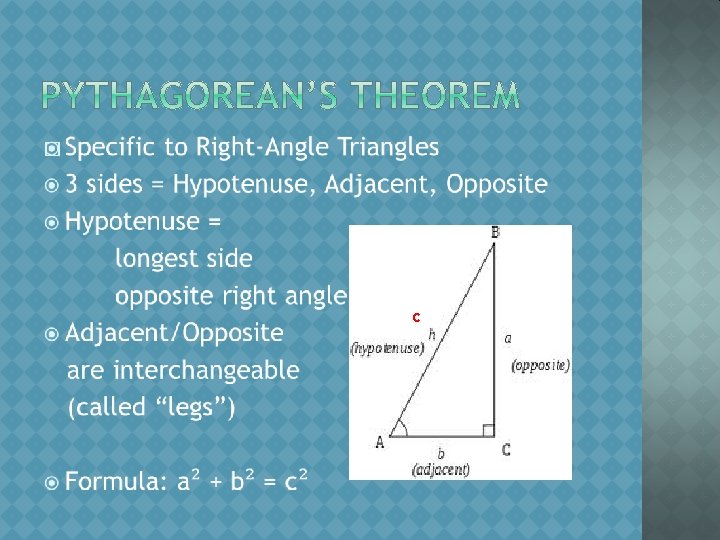 � ANGLES OPPOSITE ANGLES – non-adjacent angles that are formed by two intersecting lines ADJACENT ANGLES – angles that share a common vertex and a common arm VERTEX – a special kind of point that describes the corners or intersections of geometric shapes COMPLIMENTARY ANGLES – two angles that add up to 90 ⁰ RIGHT ANGLE – one angle that is 90 ⁰