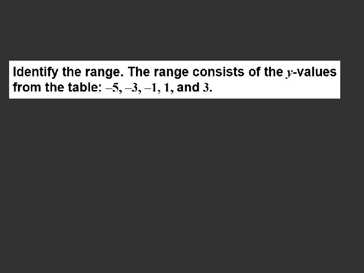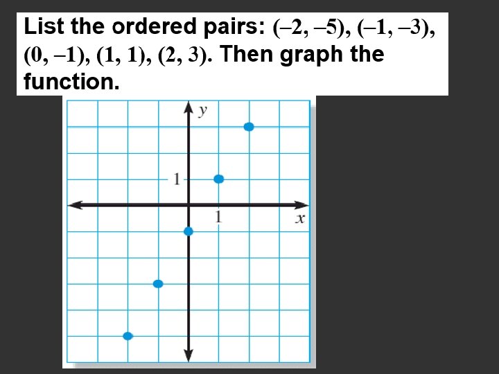 Ordered Pairs Domain - set of x-values. Range - set of y-values. { (3, -2), (4, 1), (-3, -4), (0, 2), (-4, 0) } 1) State the domain. { 3, 4, -3, 0, -4} 2) State the range. { -2, 1, -4, 2, 0 } 3) Plot the Points y x